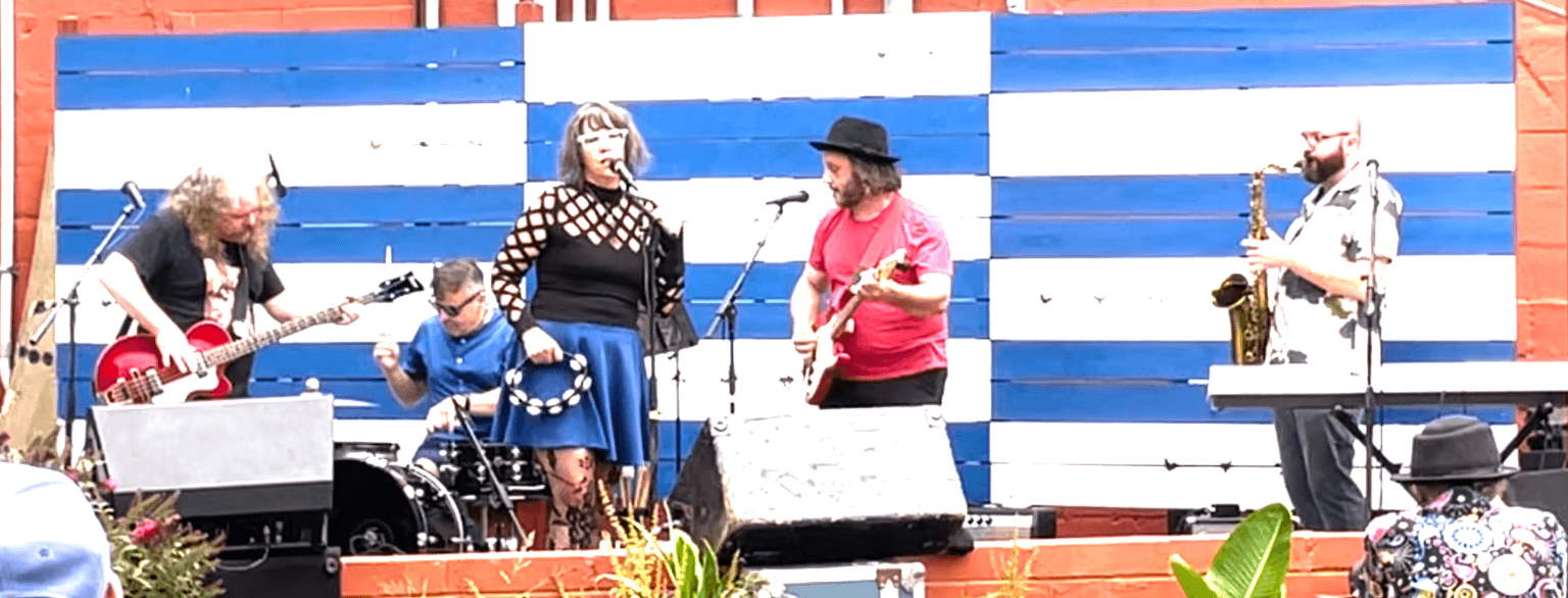 In late 2016, Jen’s search for a baritone saxophone player to fulfill her vision of a complimentary tone to her own shredding electric mandolin style came to fruition when Matt King joined the band. He brought with him a background in jazz, skills on keyboard, and backing vocals that collectively began to evolve the band’s sound. Months after Matt joined the group, Madelyn’s departure initiated years of different drummers trying to fit the unique sonic signature of Kiss Me Deadly. A busy festival and concert schedule was brought to a hiatus by the Covid Pandemic, which only allowed Jen, Evan, and Matt to live stream shows from the comfort of their shared apartment on platforms such as the 48 Hour Virtual Music Fest. In 2021 they began playing with drummer John Scully, who’s blend of world beats with punk and jazz influence fit seamlessly into the growing sound of Kiss Me Deadly. The band began to tour again throughout the northeast while exercising their affinity to create upbeat, genre-bending music. In the midst of a show-heavy schedule, Jen tragically broke her wrist, and the band sought help from their friend, Chris Frohring, who happily stepped in so KMD did not miss any shows. Chris’s distinctive psychedelic, hook-centric guitar playing not only filled the gap while Jen’s injury healed, but his musical affinities and abilities augment Kiss Me Deadly’s progressing arrangements. Four months later, Kiss Me Deadly recorded tracks for “Ship Of Theseus” at Redefer Studio in Ohio University’s Schoonover Center. With Jen Poland leading the audio engineering, the band’s first self-produced album was underway. While Jen and Matt mixed “Ship Of Theseus,” local Clevelander and founder of the music focused fanzine “CLE Magazine,” Jim Ellis approached the band with the opportunity to record a three song EP for his new record label CLE Records. Kiss Me Deadly quickly recorded “Hootenanny” at the legendary SUMA Recording Studio with multi-platinum award winner Michael Seifert. After a successful session at SUMA, CLE Records and Kiss Me Deadly decided to move forward with a full length album to be recorded at SUMA in 2026.
